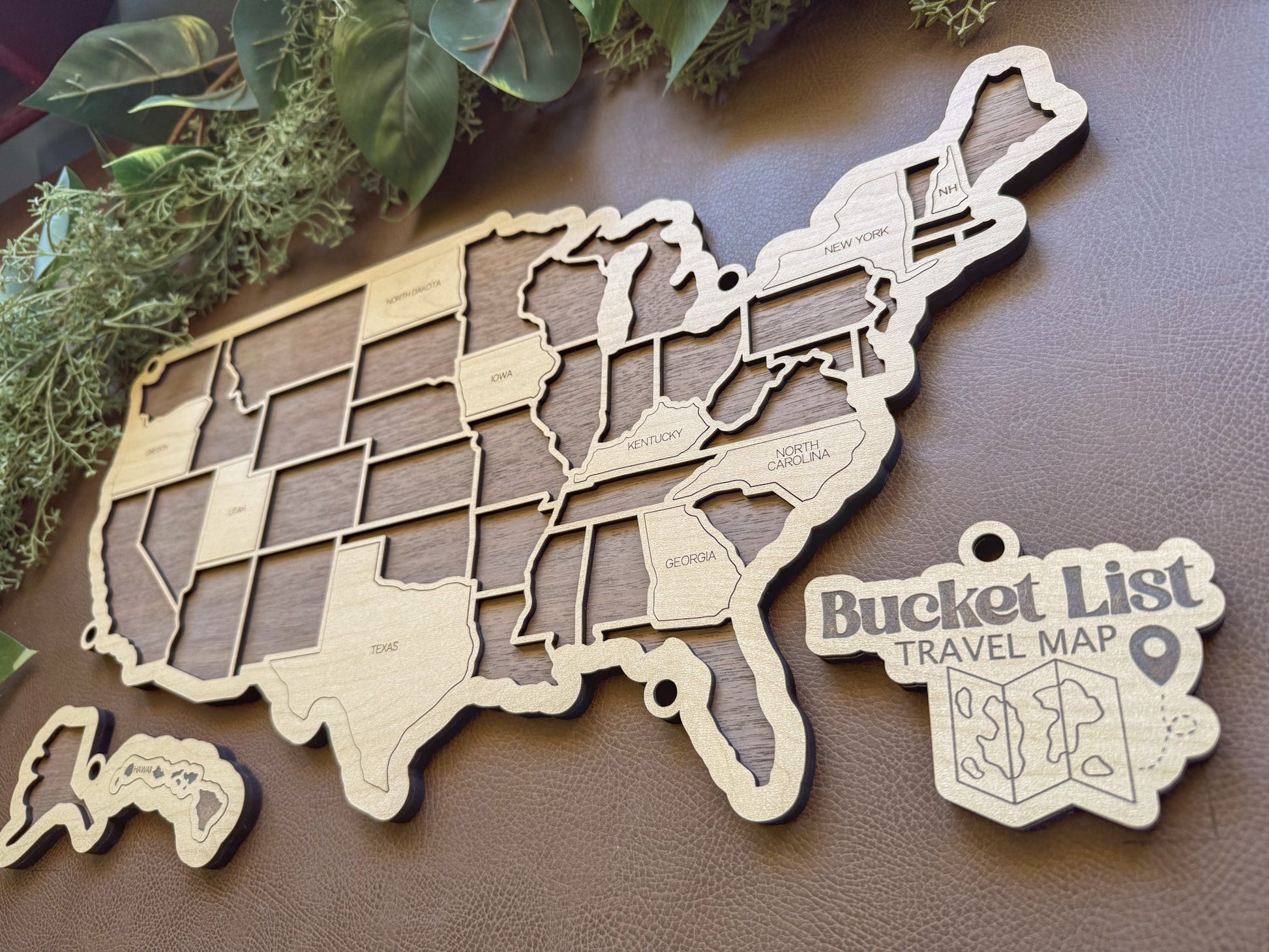 Handcrafted wooden map with 50 individual state-shaped tokens