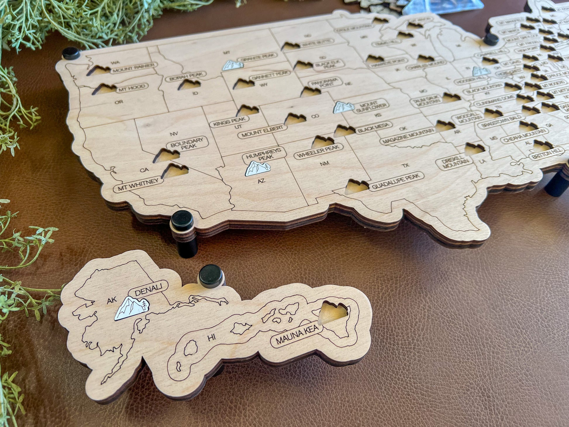 Handcrafted wooden map featuring each state’s highest point (specific location)