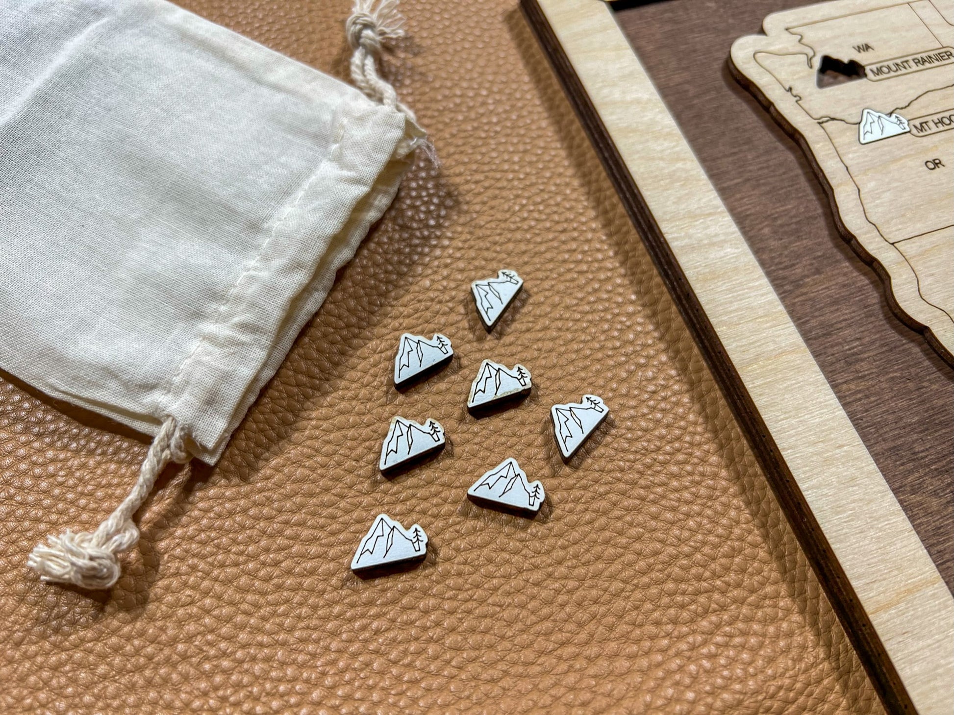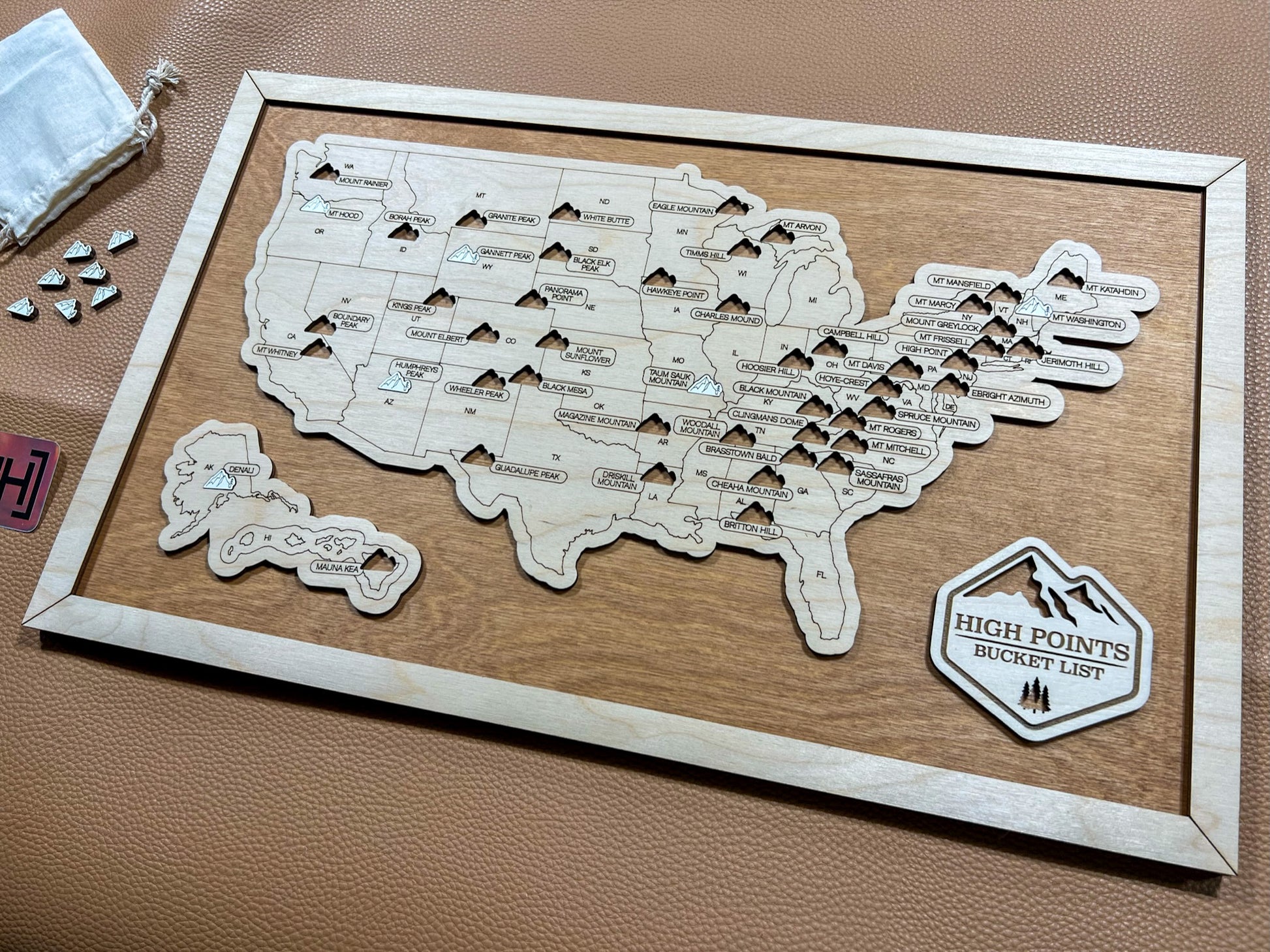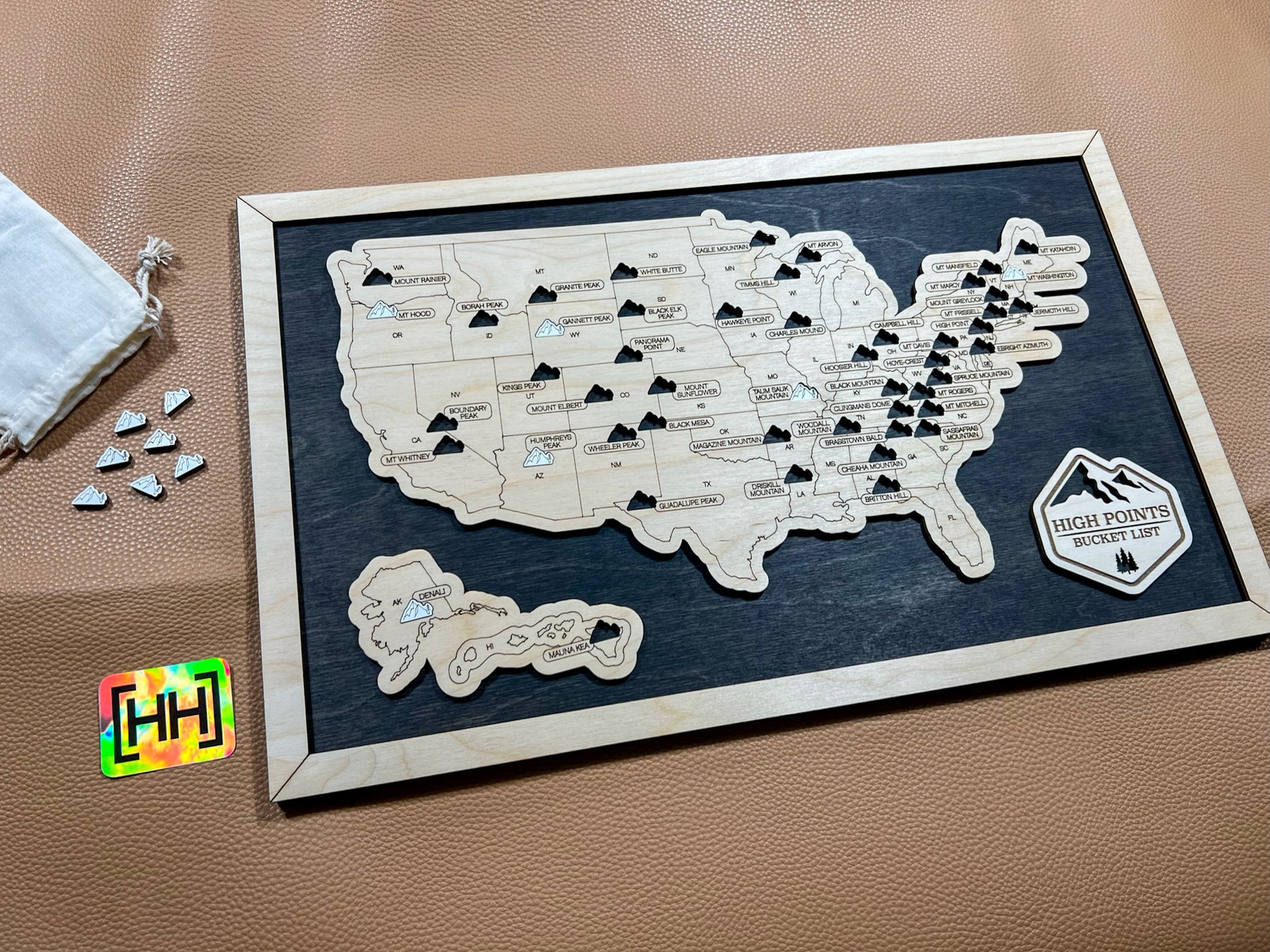 Each map is handcrafted and features a pre-cut hole for every curated high point, matched to a 3M-backed, color-printed token you can place once you reach it. Whether you're bagging summits or driving scenic roads to these geographic milestones, this map becomes a personal record of your pursuit.