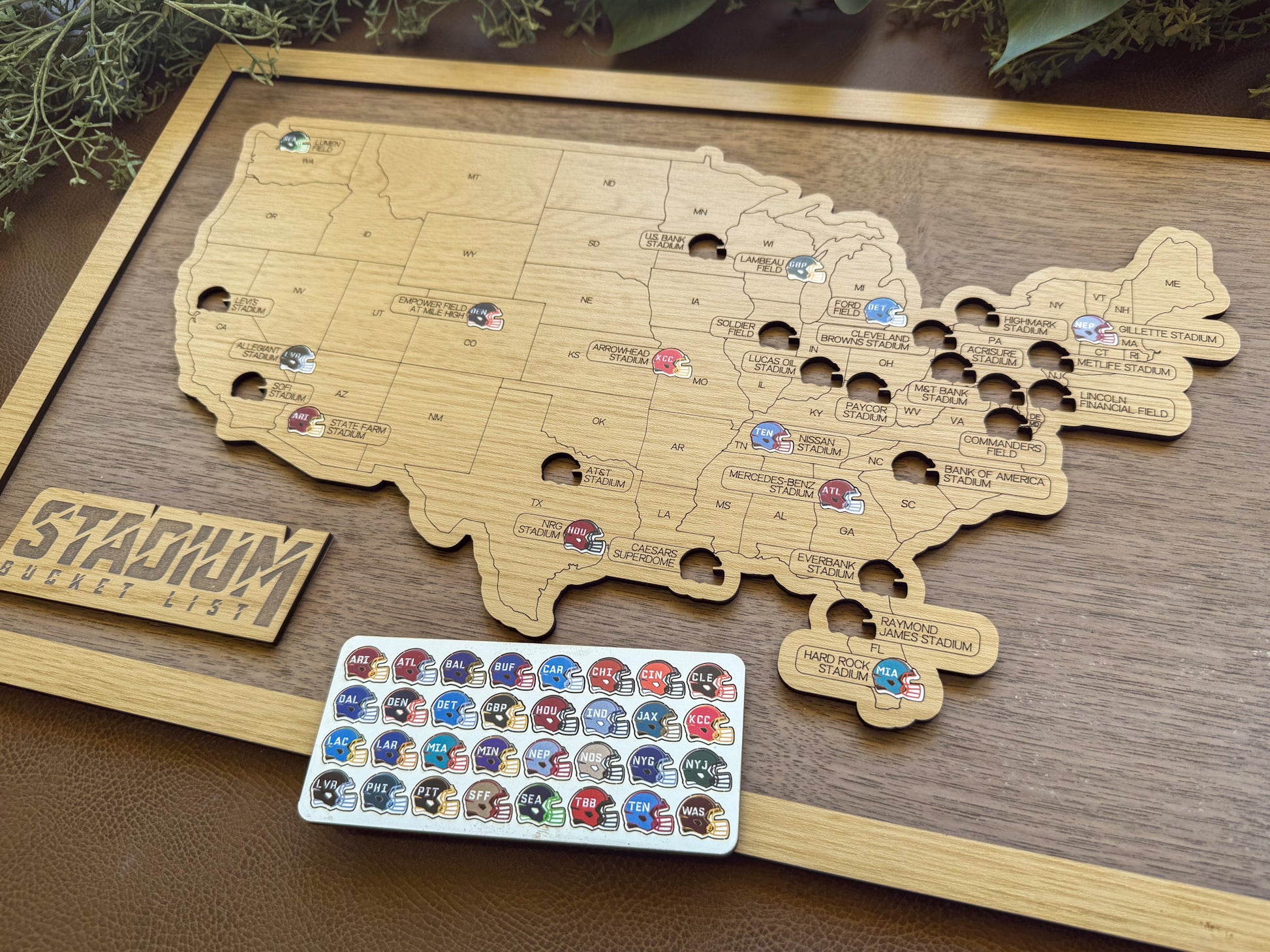 This handcrafted wooden map features a curated list of professional U.S. football stadiums. Just place a 3M-backed token into each pre-cut hole as you visit. From unforgettable game days to epic road trips, this is how fans show where they've beenāand where theyāre headed next.