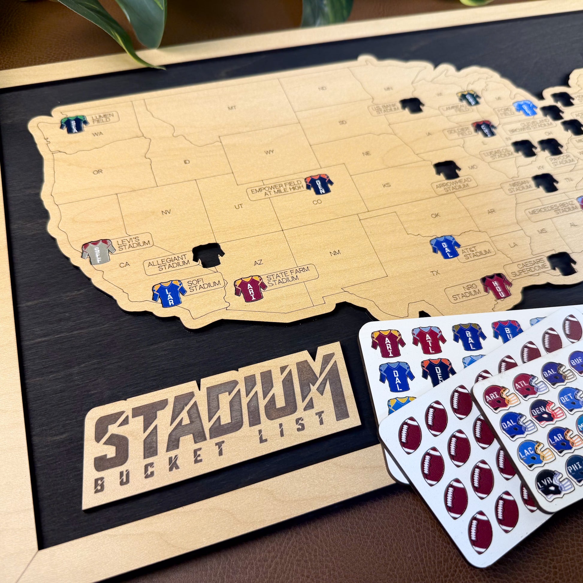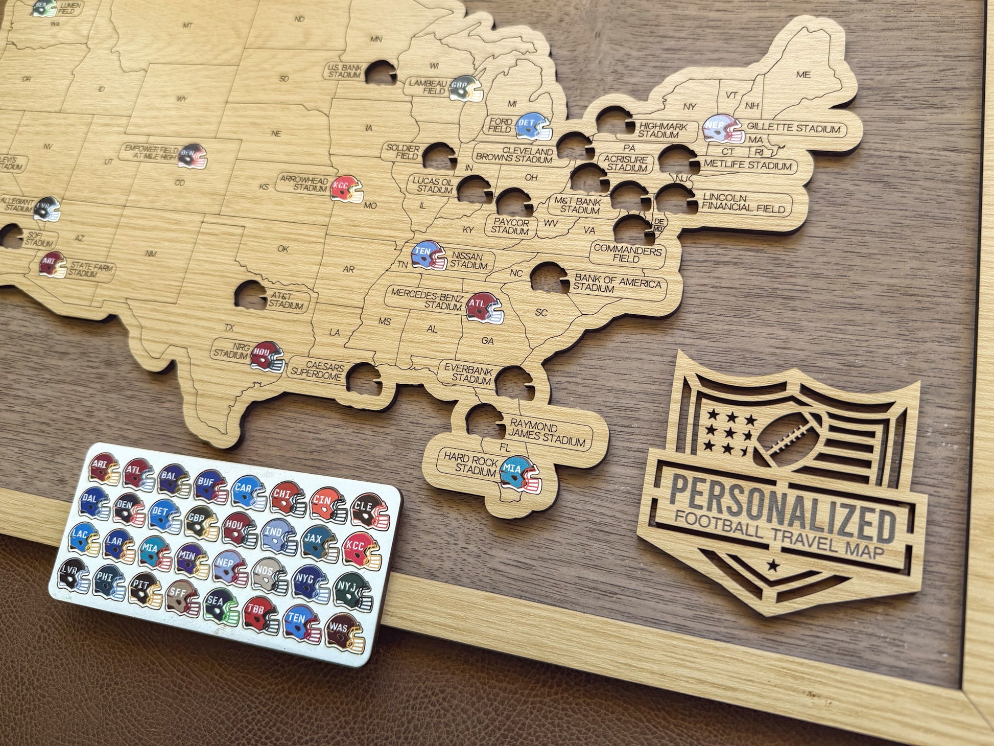 Handcrafted wooden map with pre-cut holes for each pro football stadium