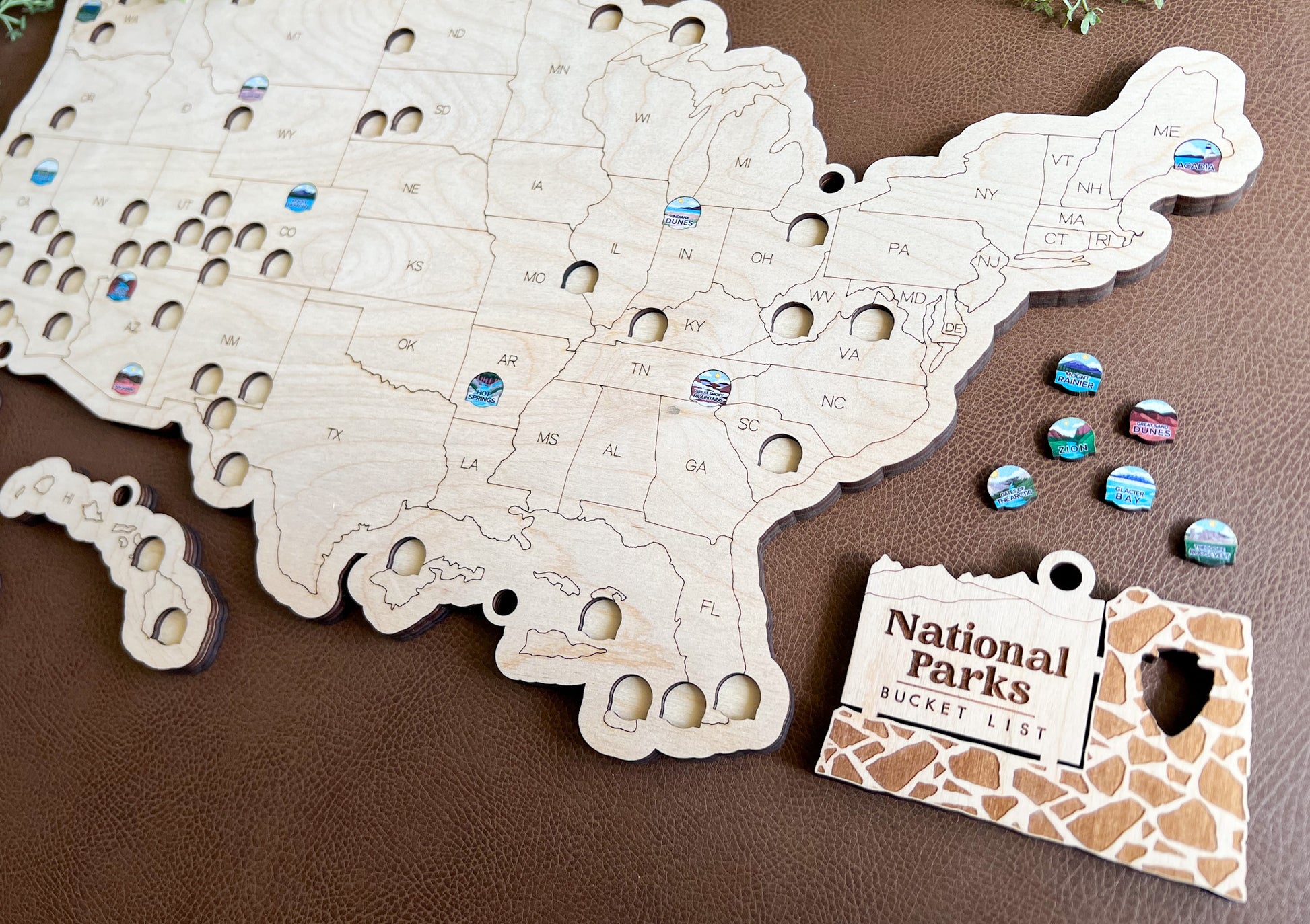 Celebrate every breathtaking view, trail, and memory with our handcrafted National Parks Bucket List Map. Designed for nature lovers, road trippers, and outdoor enthusiasts, this interactive wooden map lets you track your visits to each U.S. National Park using beautiful, color-printed tokens.